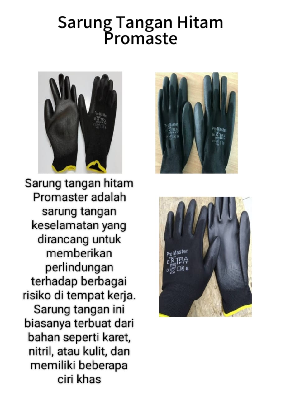 Sarung tangan Promaster adalah jenis sarung tangan safety yang dibuat dari bahan berkualitas seperti kain rajut dengan lapisan nitrile atau latex coating. Produk ini dirancang untuk melindungi tangan dari risiko kerja seperti gesekan, abrasi, serta paparan kotoran.